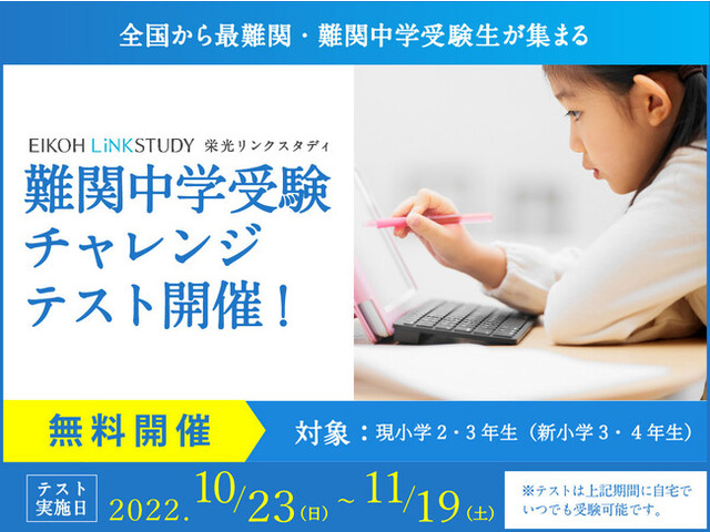 株式会社増進会ホールディングス(Z会グループ)のグループ会社、株式会社栄光(本社:東京都千代田区 代表取締役社長:下田勝昭)が運営するオンライン進学塾「EIKOH LiNKSTUDY(栄光リンクスタディ)」は、難関中学進学を目指す小学2・3年生を対象に「難関中学受験チャレンジテスト」を実施します。