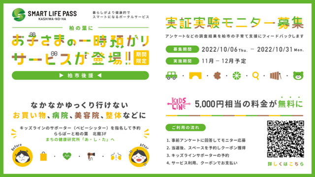 株式会社キッズライン(代表取締役 経沢香保子、以下「キッズライン」)、三井不動産株式会社(代表取締役社長 菰田正信、以下「三井不動産」)、一般社団法人UDCKタウンマネジメント(以下「UDCKタウンマネジメント」)は、柏市の子育て支援ニーズを把握するため、柏市と協力しながら一時預かりサービスを無料利用できる実証実験を11月8日(火)より開始します。また、参加者の募集を10月6日(木)より開始します。