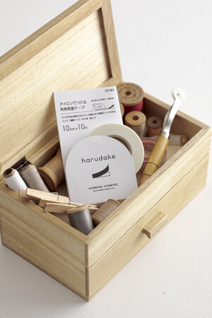 『harudake』には強力な接着力があり、ミシンや針・糸がなくてもアイロンをかけるだけで、ズボンやスカートの裾上げやバッグなどの布小物、簡単なスカートが作れます。用途に応じて7mm・10mm・15mmの3サイズを展開します。