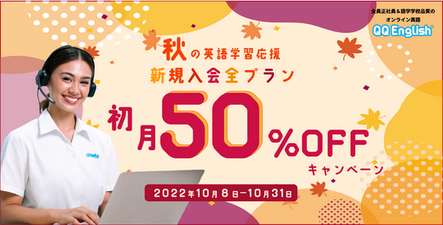 株式会社QQ English (本社:東京都渋谷区、代表取締役:藤岡 頼光)は、提供するオンライン英会話サービス「QQ English」「QQキッズ」にて、2022年10月に新規入会された方を対象に「全プラン初月50%OFFキャンペーン」を実施することをお知らせいたします。