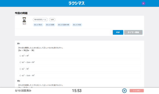 ラクシマスは、指定した単元から基本問題10問のセットを自動作成できる、高校生向けの数学学習サービスです。作成した問題セットは、その場でタイマー付きのテスト・採点・解説による見直しまで行えます。Googleのアカウントがあれば、誰でも無料で利用することができます。