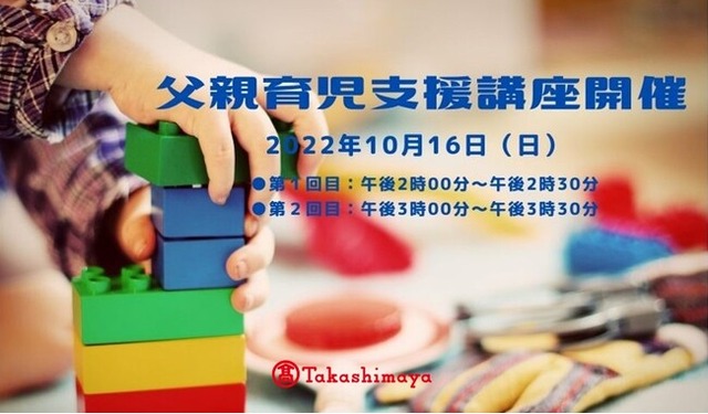 そこで横浜高島屋では、横浜市こども青少年局地域子育て支援課とともに、父親育児の機運を高めることを目的とした父親育児支援講座を開催します。子育て支援拠点や地域ケアプラザの講座に参加するのは気が引けてしまうというお父様方にもお気軽にご参加いただける内容となっております。
