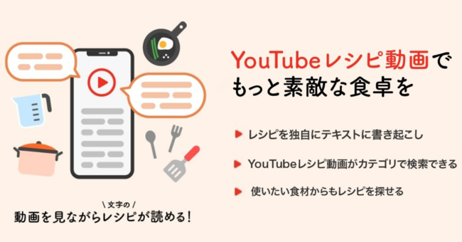 「レシピのレパートリーの不足」という問題を解決するため、大多数の人が料理系YouTuberの動画を参考にしております。TubeRecipeはYouTube上にあるレシピ動画と多くの人がいろいろな角度で出会えるように、材料や手順をテキスト化し独自のカテゴリ分けをしており、「国別」や「材料」だけでなく、「スピード料理」「アイデア料理」など50以上のカテゴリからレシピを探すことが可能です。さらに材料や手順がテキスト化されることで、動画を見なくても材料や手順が確認でき、料理中に動画の再生バーを動かす必要がなくなります。