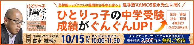 本オンラインセミナーでは富永より、ひとりっ子(さらに男の子・女の子)の特徴を最大限に生かしつつ、偏差値レベルに合った無駄のない勉強法を、国語・算数・社会・理科4教科について具体的に伝授いたします。