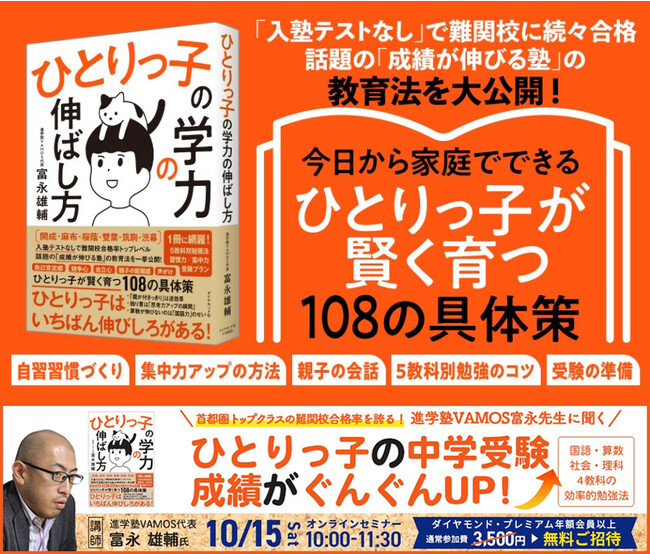 東京を中心に認可保育所をはじめとする、子ども・子育て支援事業を展開する株式会社さくらさくプラスの子会社、進学塾運営の株式会社VAMOS代表取締役富永雄輔が執筆する書籍「ひとりっ子の学力の伸ばし方」がダイヤモンド社より出版され、このたび14,000部を達成いたしました。なお、本書籍の評判を記念し、富永によるオンラインセミナーを10月15日(土)に開催することをお知らせいたします。