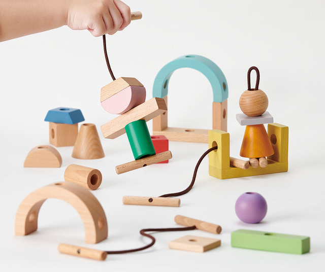 ひもを通す方向を変えたり、ピースを組み合わせて長いひもにしたり・・遊ぶ度に新たなひもの通し方を発見することができます。