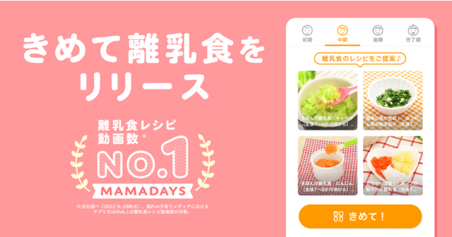 株式会社エブリー(本社:東京都港区、代表取締役:吉田 大成)が運営する『MAMADAYS(ママデイズ)』は、離乳食レシピ動画数No.1*のファミリー向け動画メディアです。この度、同シリーズの新 アプリとして「きめて離乳食」をリリースいたしました。本アプリは、管理栄養士が監修した400以上の離乳食レシピ動画から、お子さまの月齢に合わせたレシピを4つ自動で選定してくれます。また、離乳食初期のお子さんをお持ちの方にも分かりやすい進め方コンテンツも搭載しているので、どなたでも安心してご利用いただけます。