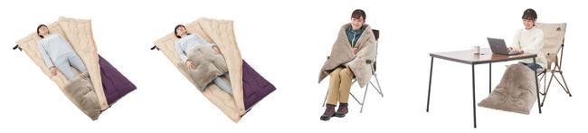ジップスライダーが2カ所ある「ダブルファスナー」採用でフレキシブルな温度調節ができる。ドーナツ状にすればお腹周りも温めることができるほか、広げれば約160cmと大きなブランケットにもなり、シーンに応じて使い分け可能。また、内側と外側の両方からジッパーの開閉が可能な「ダブルフェイスジップトップ」採用。