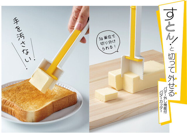 2.使い方は簡単。バターカッターで切り取ったバターはワンタッチで押し出して取り出せます。バターを取り出す時も他の道具を使う必要がないので手が汚れません。既存のバターカッターでは切り取り後にバターが商品にくっついてしまうことがあり、箸やスプーンなどでくっついたバターをかき出すなんてこともしばしば…。そんなバターカッター使用時の手間やわずらわしさから解放されます。