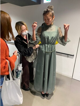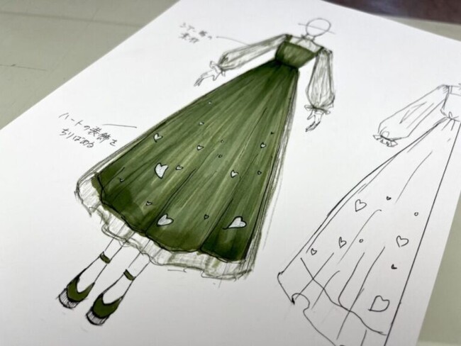 6名のデザイン画を西山さんに見ていただき、その中の1点が今回の衣装デザインに採用され、学生は制作に取り掛かり始めました。西山さんの肌の色に合わせて生地を選び一つ一つ丁寧に制作し、当日のフィッティングではサイズがご自身にピッタリだと西山さんから絶賛いただきました。