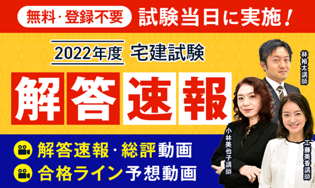 令和4年度宅建試験を受験される皆様への応援企画として、アガルートアカデミーでは試験当日の10月16日(日)に 「解答速報」「合格ライン予想」「試験総評動画」の公開を実施いたします!