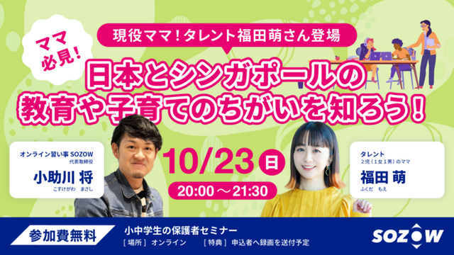 今回のセミナーでは、2021年にシンガポールに移住をした2児の母であるタレント福田萌さんに、日本とシンガポールの教育や子育てのちがいについて経験したことをお話しいただきます。