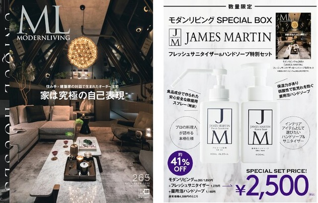 10月14日(金)に発売されるラグジュアリー住宅誌『モダンリビング』265号の誌面にて、ジェームズマーティンの人気アイテム「フレッシュサニタイザー」と「薬用泡ハンドソープ」を紹介いただいております。本号では通常版に加え、洗練されたインテリアに馴染むデザイン性と、ファブリック製品からキッチンアイテムまで多用途にお使いいただける除菌・消臭アルコール製剤「フレッシュサニタイザー」と保湿力と消臭力に優れた「薬用泡ハンドソープ」をセットにしたスペシャルボックスが発売されます。