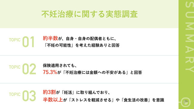 調査対象者の約半数が自信や配偶者の不妊の可能性を考えたことがあるにもかかわらず、実際に不妊治療・検査をした人が少ないことが分かりました。また、不妊治療に対して「高額な治療費がかかる」というイメージをもち、保険適用になった今でも、75.3%が「不妊治療には金額への不安がある」と回答しました。