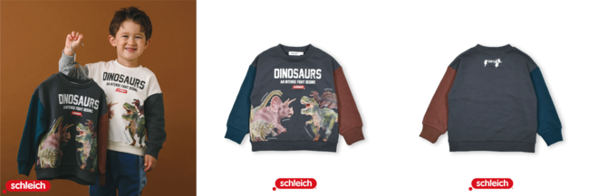 「ティラノサウルス(オフホワイト)」「テリジノサウルス(ブラック)」「ギガノトサウルス(テラコッタ)」がそれぞれプリントされた長袖トレーナー。