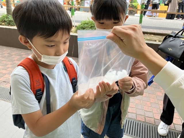 今回、ほくせつ親子防災部様※1のブースにて出展させていただき、来場者様に向けて簡易トイレを展示・使い方レクチャー、子どもたちに向けて凝固剤の体験会を実施いたしました。凝固剤で水を固める体験をした子どもたちは「ゼリーみたい!」や「すぐ固まった」と驚きの反応で、実際にゼリー状に固まった水を触ったりして楽しんでいただきました。また、保護者様からは「トイレは備えていなかった」や「凝固剤を備えているが使ったことがない」など、災害時のトイレの重要性を改めて感じていただき、使用方法も理解していただく良い機会となりました。