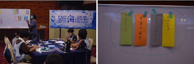 最後のまとめ学習は初日と2日目の夜に振り返り学習を担当し、本イベントの監修を務めるしかたに自然案内の鹿谷麻夕さん。振り返りでは、それぞれのプログラムで知ったこと、考えたこと、感じたことを書き出しました。それらを元に、未来の海に向けたメッセージを作ります。今回は沖縄の文化である琉歌(8・8・8・6)のリズムで言葉を考えました。琉歌は前半の8・8で風景や出来事を、後半の8・6で心や気持ちや希望を表現します。班のメンバーで意見を交わし、合計6種の琉歌が生まれました。このあと、琉歌に含まれるメッセージをデザイナーが吟味して、最後に学んだ農業生産法人畑里さんの月桃茶のパッケージに載ります。また、望ましい島や海をイメージしたイラストも描き、こちらもパッケージに表現されます。さらに那覇市と浦添市を走る沖縄都市モノレール「ゆいレール」と「しまうみ探検隊in石垣」がタイアップし、11月に特別車両内でイベントが紹介される予定です。