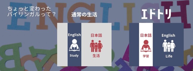 多くの子どもたちは、日頃、生活時間は日本語、英語学習の時間にだけ英語に触れる生活を送っています。エドトリはその全く逆の言語で過ごします。一日の大半を占める生活時間を英語。学習プログラムは日本語です。