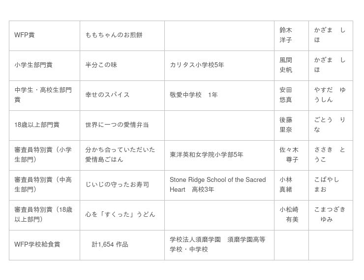 4.佳作 各部門5名 5.WFP学校給食賞(応募数上位の学校・団体)