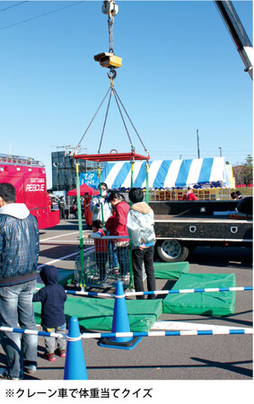 ■クレーン車で体重当てクイズ 「3人以上でカゴに入り体重測定、予想した体重と3kg誤差内なら正解で粗品プレゼント!」