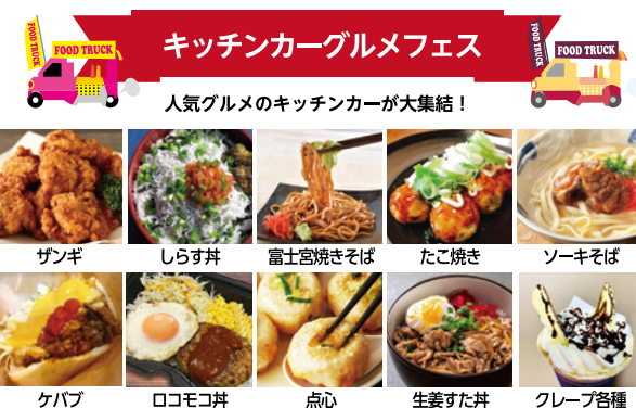 北海道ザンギ、しらす丼など、バラエティ豊かなグルメキッチンカーが大集結します。