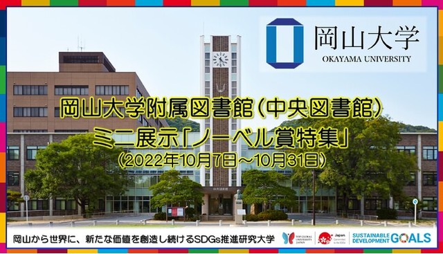 国立大学法人岡山大学(本部:岡山市北区、学長:槇野博史)の津島キャンパスにある岡山大学附属図書館(中央図書館)では、2022年10月7日から「ノーベル賞特集」と題したミニ展示を行っています。