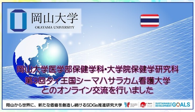国立大学法人岡山大学(本部:岡山市北区、学長:槇野博史)の医学部保健学科・大学院保健学研究科は、2022年9月24日(土)、部局間協定を結んでいるタイのシーマハサラカム看護大学と 2020年、2021年に続き、本年度も Zoomによるオンライン交流会を開催しました。