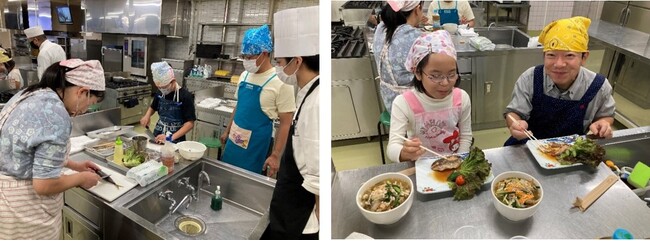 岡山県内の親子6組17名が参加。講師の指導のもと、参加者たちは基本の魚のアジに加え、岡山県内で広く食べられる舌平目(ゲタ)の2種類の魚のさばき体験に挑戦。参加した子どもたちの中には、魚をさばくことが初めてだという参加者も多く、講師である長石先生やスタッフにコツを教わりながら、見よう見まねで果敢にチャレンジしていました。特に、舌平目(ゲタ)は、アジに比べ平べったい形をしているため、アジ以上に苦戦しながら、参加者は慎重に包丁を入れていました。ゆっくりと時間をかけて、親子で楽しくアジと舌平目(ゲタ)をさばいていきました。さばいた後は、手順よく調理して「アジの照り焼き」と岡山県牛窓エリアの郷土料理「舌平目(ゲタ)のかけ飯」が完成。そして、調理した二品を参加者全員で試食。海の恵みに感謝をしながら、参加者は美味しそうに箸を進めていました。