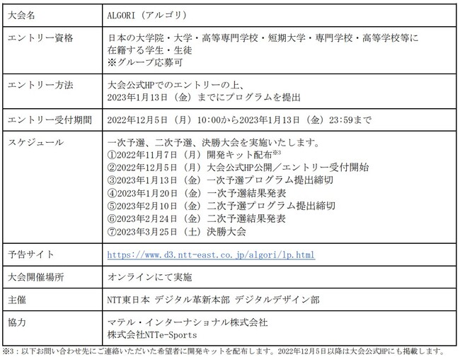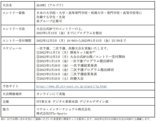 開催にあたり、参加者向けのプログラム開発キットを2022年11月7日(月)より配布し、2022年12月5日(月)エントリー受付を開始します。