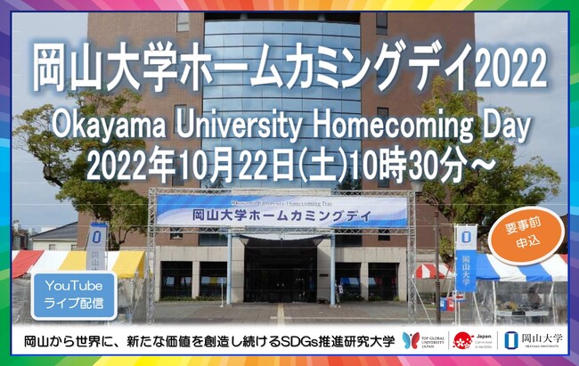 国立大学法人岡山大学(本部:岡山市北区、学長:槇野博史)は、2022年10月22日(土)に「岡山大学ホームカミングデイ 2022」を岡山大学津島キャンパスと鹿田キャンパスで開催いたします。