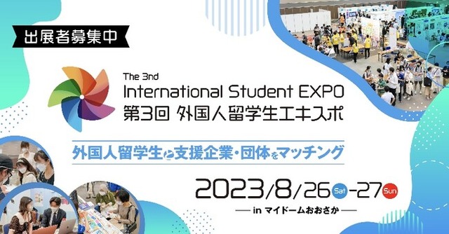 外国人留学生エキスポ実行委員会は、2023年8月26日(土)~8月27日(日)に、外国人留学生のお悩み解決・国際交流をテーマとした、「第3回 外国人留学生エキスポ(International Student EXPO)」をマイドームおおさかにて開催します。