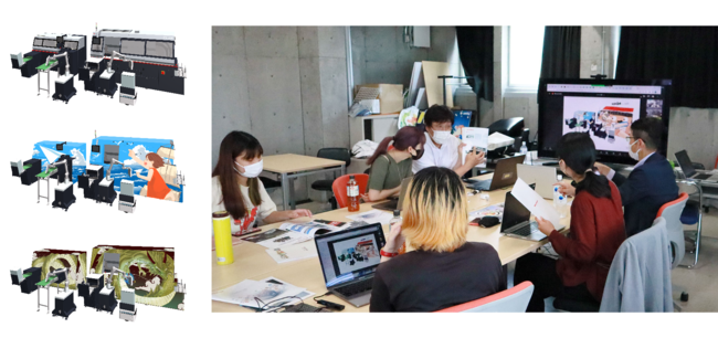 スマートファクトリーとして効率的な印刷製本の作業環境を考えるにあたって、京都芸術大学 芸術学部 キャラクターデザイン学科と株式会社ホリゾン 戦略企画本部 ブランドデザイン課が協働し、業務用製本機器の外観イメージを刷新することに取り組みました。参加学生からは「紙飛行機」、「龍」、「同人誌文化」、「ゲームセンター」、「花札」など紙や日本文化をモチーフにした多種多様なアイデアが生まれました。いずれも魅力的なデザインでしたが、IGASは海外来場者も多いことから、浮世絵の「富嶽三十六景」「三大美人」をモチーフにコミカルにアレンジした秋元咲来さんのデザイン案が採用されました。IGAS2022(東京ビッグサイト東6ホールSmart Factory Zone)にてラッピングされた実機が展示されます。