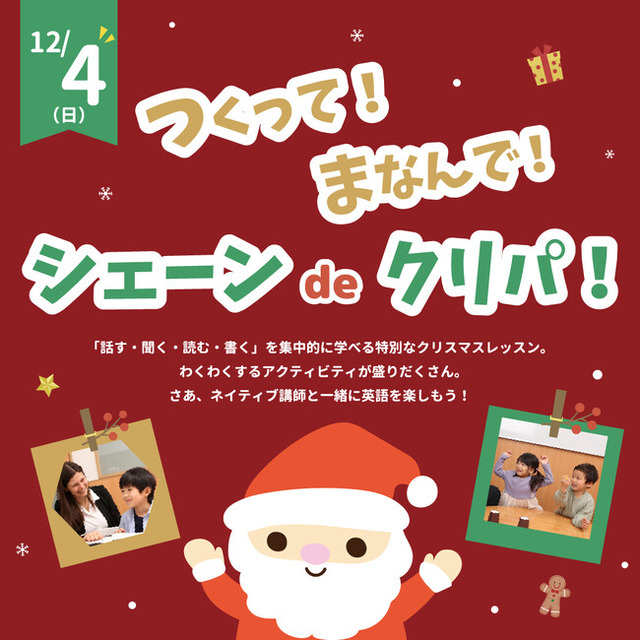 スクールでの通常レッスンとは一味違う、特別なレッスンが受けられる1日です。年少から小学6年生まで年齢ごとに、クリスマスをテーマにぬり絵やゲームをしながら、楽しく英語を学べるレッスンです。1日完結のレッスンなので、シェーンに通っていないお子様もシェーンのレッスンを体験できる機会です。