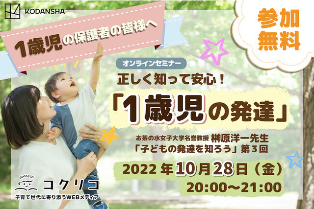 株式会社講談社の子育て情報メディア「コクリコ」(https://cocreco.kodansha.co.jp/)は、2022年10月28日(金)にオンラインライブセミナーを開催します。子どもの発達研究の第一人者である、お茶の水女子大学名誉教授・榊原洋一先生を講師に招き、「1歳児の発達」について、パパママの心配や疑問に応えます。
