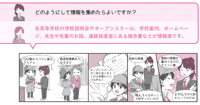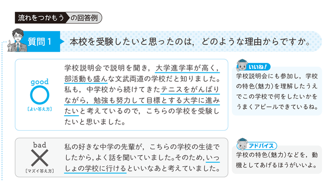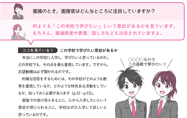 攻略ポイントを3つに分類。イメージしやすいマンガやイラストを添え、本番までのポイントをQ&Aで押さえて、よく出る質問に回答する準備を進めていきます。高校側が知りたいと思っている、筆記試験ではわからない人柄やその学校で学びたいという意欲について、自分の言葉できちんと答えられるようにしていきます。