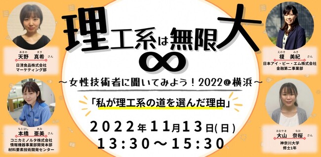 このたび、企業で活躍する3名の女性技術者と理工系分野を学ぶ大学生が、仕事や学生生活についてパネルディスカッションを行うオンラインセミナーを開催します。