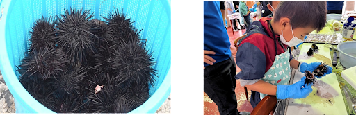 3.鳥取県沿岸で起きている磯焼けについて学び、ムラサキウニの殻割り体験