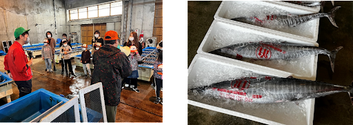 秋のひんやりとした空気に包まれた10月上旬の鳥取港。セリが始まる前の午前7時30分に集合した8家族19人の参加者は、まず水揚げされたばかりの魚を見学しました。この日は、大ぶりのアジをはじめ、鳥取では秋が旬のサワラ、高級魚として知られるキジハタなど様々な魚が水揚げされていました。漁協の担当者の方から「今日は0.5トンくらい。これでも少ない方で、カニのシーズンは7トンもの魚が並びます。」と説明を受けていました。そして、午前8時。いよいよセリがスタート!威勢の良いせり人の声が響き、仲買人によって次々と魚が競り落とされる様子はまさに大迫力です。参加者は水揚げされた魚がどのように競り落とされるのかを体感していました。