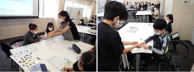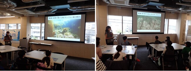 しかし、いまと同じようには食べられなくなるかもしれない、近年話題となっている海の環境問題「磯焼け」現象についてお話しました。「磯焼け」とは、海藻の集まりである藻場がなくなったり減ったりしてしまうことです。子どもたちは藻場が豊かな海と、磯焼けしている海の様子の動画を見てその違いを確かめ、藻場が海の生き物や環境にとって大事な役割をしていると知ることができました。さらに藻場再生に取り組む企業の事業やNPO法人の取り組みについても触れ、今後、自分たちにできることは何かを考えるきっかけになりました。