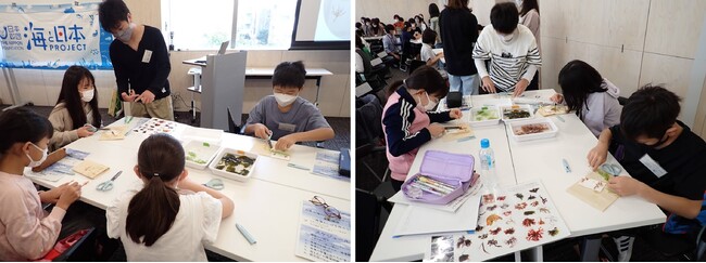 水産加工食品を中心に幅広く製造・販売している株式会社なとり(以下、なとり)の協力を得て、東京都北区・文京区に在住・在学の小学4~6年生を対象に「海藻」をテーマとしたイベントを実施しました。イベントでは、植物と対比しながら海藻について理解を深めたり、本物の海藻を手に取って触ったり、海藻おしばを作る体験をしました。さらに海藻をめぐる海の環境問題「磯焼け」について知ることで、海の環境と私たちとの関わりについても考えるきっかけに。今回は第1回お茶大海のジュニアティーチャー養成講座を受講した中学生が、特別講師として参加しました。本イベント受講後、晴れて海のジュニアティーチャーとして認定された小学生は、今後、海洋教育の担い手としてさまざまな取り組みに参加することが期待されています。