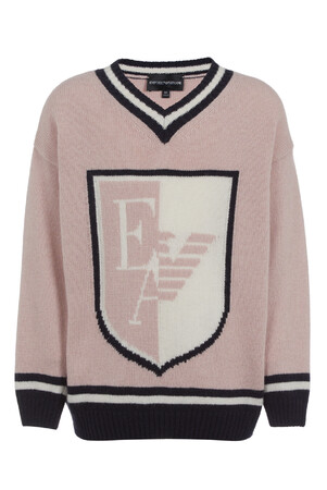 プルオーバーニットはフロント部分の大きなエンブレムデザインが特徴。エンポリオ アルマーニのアイコン「イーグル」ロゴとEAの文字を組み合わせ、とびきりおしゃれなエンブレムが出来上がりました。