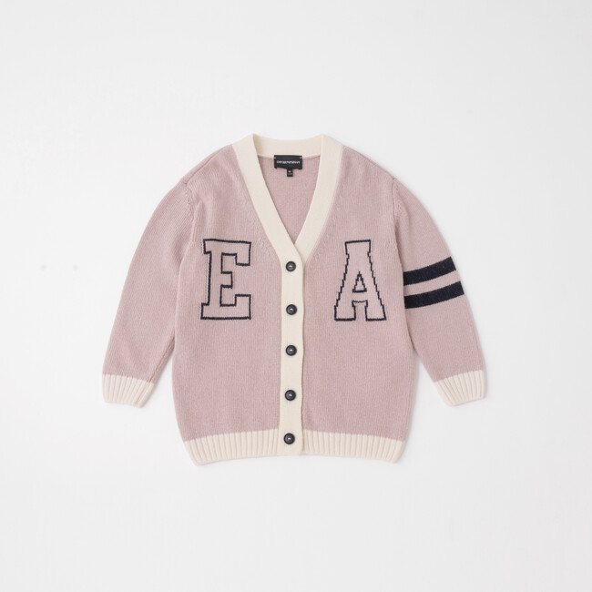 カーディガンはネイビーとピンクの2色展開。ネイビーカラーはベストと同様、スカイブルーとホワイトがポイントカラーに使われています。ピンクカラーは、オフホワイトとブラックとのコンビネーション。フロント部分には大きくEAの文字、片方の袖には2本ラインが入りカレッジムードを盛り上げています。