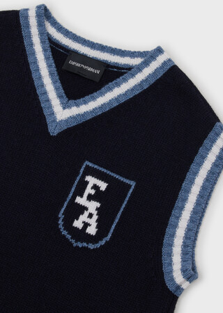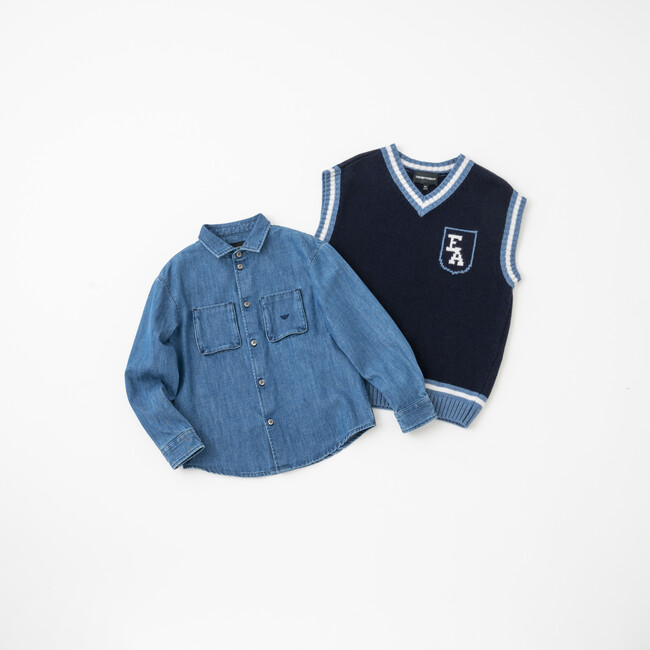 ベストはネイビーカラーにスカイブルーとホワイトのさわやかなラインが入ります。胸元にはまるでカレッジエンブレムのようにデザインされたブランドの頭文字「EA」が入りカレッジムードを盛り上げます。袖ぐりを大き目に取ることで、デニムシャツなどのやや厚みのあるシャツとのコーディネートもストレスフリーに実現。大き目のサイジングで着用しこなれ感ある雰囲気に仕上げるのもおススメです。男の子、女の子どちらでも楽しめるデザインなので、まるで制服のように、兄弟や姉妹でのお揃いコーディネートを楽しむことも可能です。