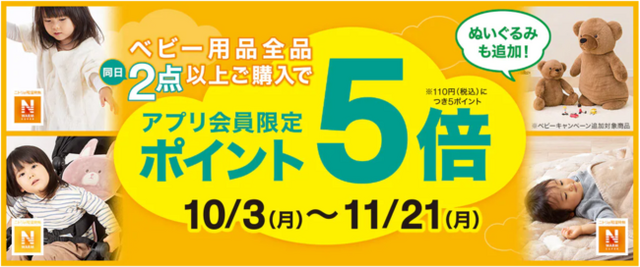10/3(月)~11/14(月)までの期間中、ベビー用品 & ぬいぐるみ を対象商品とし、同日に2点以上ご購入で、アプリ会員限定ポイントが通常の5倍付与(※110円(税込)につき5ポイント)となるお得なキャンペーンです。