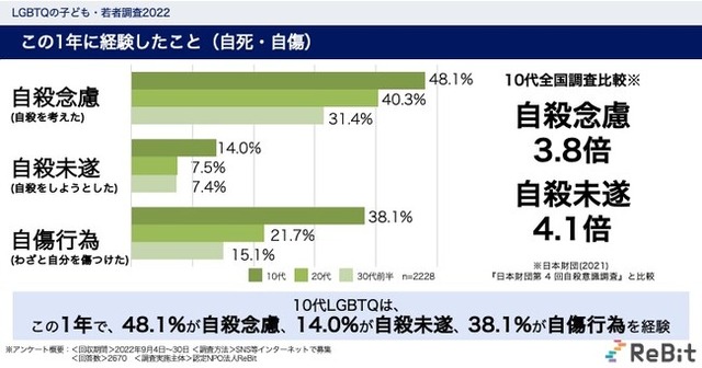 10代LGBTQは過去1年に、48.1%が自殺念慮、14.0%が自殺未遂、38.1%が自傷行為を経験したと回答。なお、日本財団の『日本財団第 4 回自殺意識調査(2021)』と比較し、10代LGBTQの自殺念慮は3.8倍高く、自殺未遂経験は4.1倍高い状況にあります。