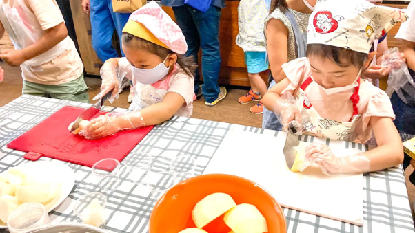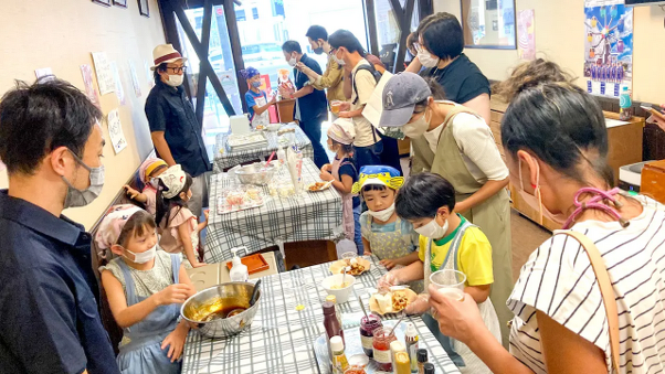 子どもたちもエプロン姿で各スイーツブースの店員さんや、イベント会場全体の受付・お会計を担当しながら、休憩時間には家族や地域の方々と一緒にスイーツを楽しみ、隣接する公園でそのまま走り回って遊ぶなど、会場アキナイ山王亭周辺は終始賑やかでした。商店街ならではのコンテンツを活かしながら、職業体験を通じて"商い"の楽しさや地元お店への貢献、地域の活性化に繋がるイベントになりました。