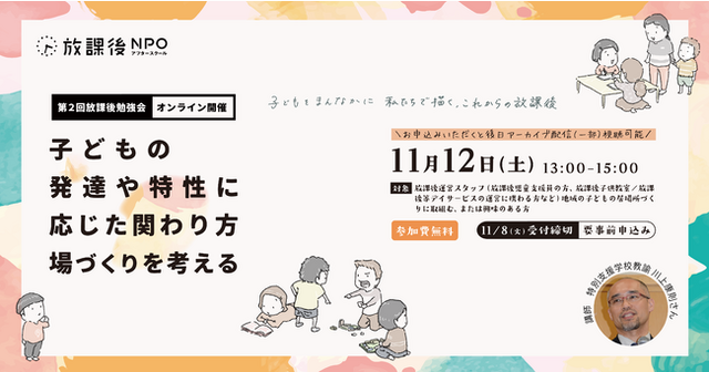 特定非営利活動法人放課後NPOアフタースクール(本部:東京都文京区 代表:平岩国泰)は、2022年11月12日(土)13:00-15:00 に、放課後の居場所運営に関わるスタッフの方を主な対象に、第2回オンライン放課後勉強会「子どもをまんなかに!私たちで描くこれからの放課後~子どもの発達や特性に応じた関わり方・場づくりを考える~」を開催します。