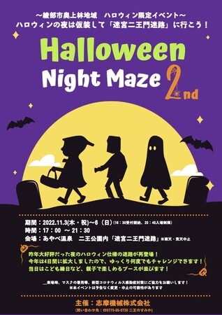 今回、地域活性化の取り組みの一環として、11月3日(木・祝)から6日(日)の4日間、あやべ温泉(京都府綾部市睦寄町在ノ向10)二王公園内の大型迷路「迷宮二王門迷路」にて、昨年大好評だった「ハロウィンナイトメイズ」を今年も開催します。