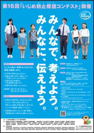 いじめ防止標語コンテスト実行委員会およびAIG損保は、全国の小学生や中学生が「いじめ」のことを忘れ、明るく楽しい学校生活を送るために、学校教育の重要課題となっている「いじめ防止」について支援していきます。