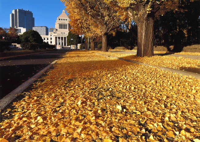 国会議事堂の正面、8車線の道路の両側に立ち並ぶイチョウ並木は線対称に配置され、威厳に満ちた趣があります。議事堂に隣接する前庭の南庭は回遊式の庭園で、四季を彩るさまざまな木々が赤や黄に色づきます。